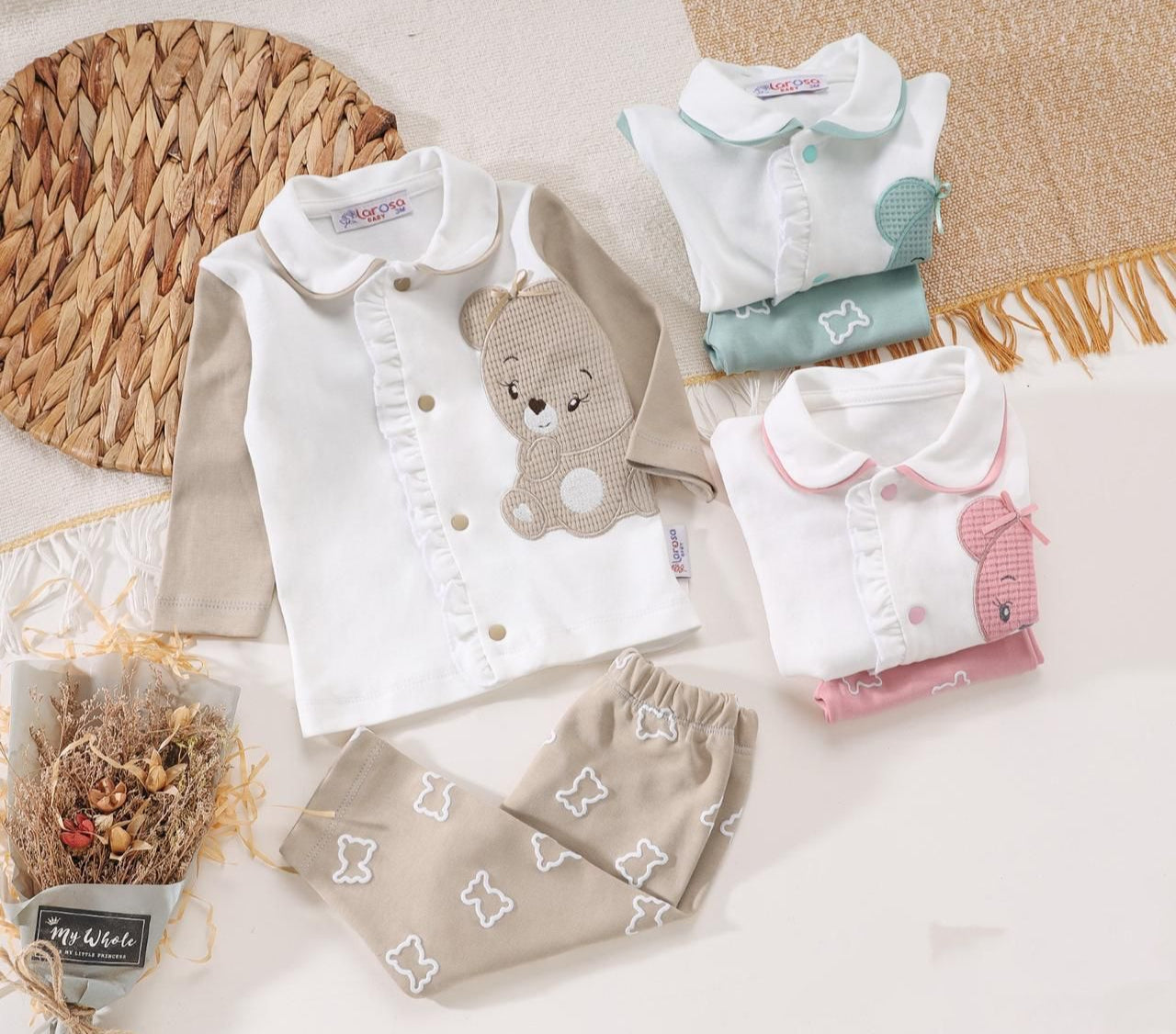 كول والدفا ييجوا مع بعض في بيجامة تيدي كوزي البناتي! مصممة خصيصًا لأيام الربيع اللطيفة، بخامة ناعمة وتصميم ناعم فيه لمسة كيوت برسمة دب من الجنب، وكابسين بطول التيشرت علشان اللبس يبقى سهل وسريع.