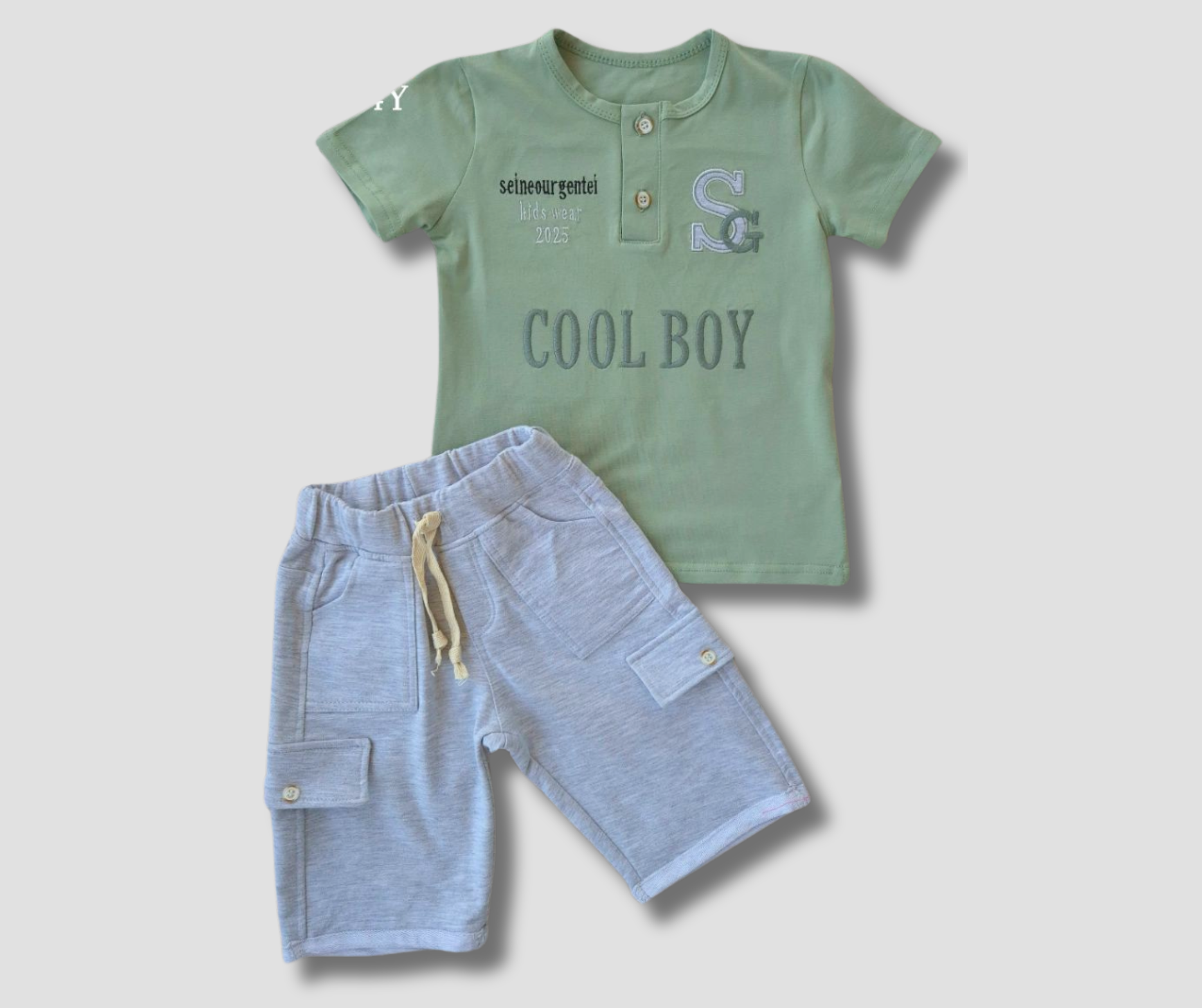 تيشيرت أخضر + شورت رمادي