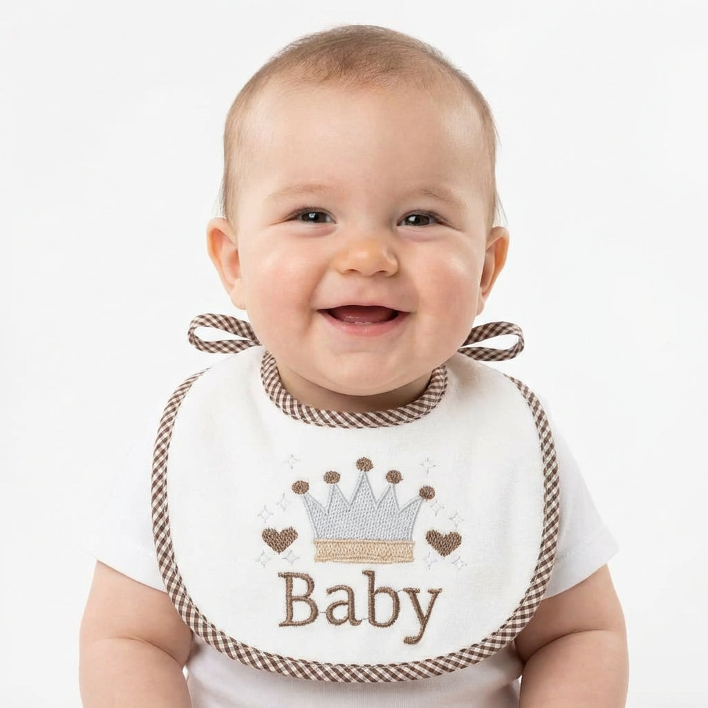 The adjustable tie closure ensures a secure yet gentle fit around your baby’s neck, while the sweet embroidered crown detail adds a charming touch. Finished with neatly stitched edges, this bib combines everyday practicality with an adorable look.