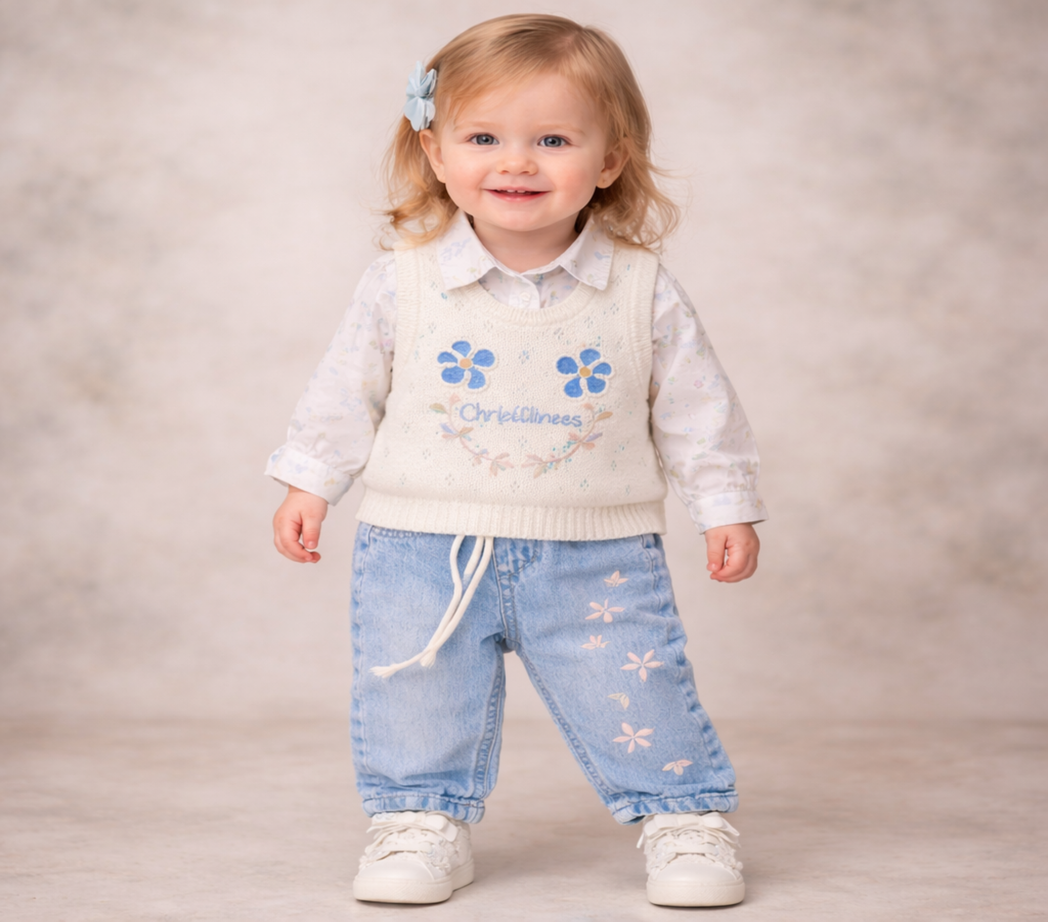 Dress your little one in sweet elegance with this charming Girls’ 3-Piece Outfit Set, designed with delicate details and a soft, classic style. The set includes a long-sleeve shirt, a knitted vest with lovely floral accents, and a comfortable pair of denim pants, creating a perfectly coordinated and adorable look.