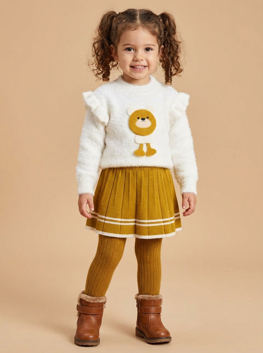 The fluffy knit sweater features a cute animal appliqué that adds a fun and charming detail, perfectly paired with a pleated skirt for a classic yet playful look. Finished with comfortable tights, this outfit allows easy movement and is ideal for everyday wear, outings, or casual occasions during cooler seasons.