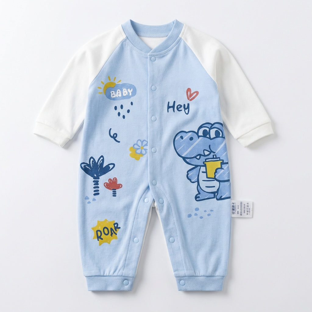 The front snap-button closure allows for easy dressing and quick diaper changes, while the relaxed fit ensures freedom of movement. Finished with fun cartoon prints and contrasting sleeves, it’s a cheerful choice for daily wear, playtime, or naptime.